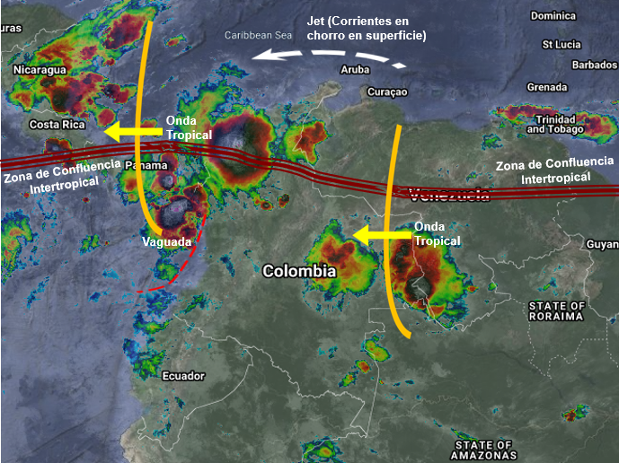El paso de Ondas Tropicales del Este genera inestabilidad atmosférica en gran parte del territorio nacional. Incremento de nubosidad, lluvias de variada intensidad y tormentas en gran parte del territorio nacional, especialmente en horas de la tarde y noche en sectores de los departamentos de Cesar, Córdoba, Sucre, Bolívar, Magdalena, Atlántico, Antioquia, Chocó, Valle del Cauca, Cauca, Nariño, Los Santanderes, Boyacá, Arauca, Casanare, Meta, Guainía, Vaupés, Caquetá, Guaviare y Amazonas. lluvias de menor intensidad en el Eje Cafetero, Tolima, Huila y Cundinamarca.