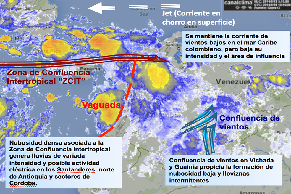 Desde la madrugada, un gran sistema de nubosidad y aire inestable asociado a la Zona de Confluencia Intertropical, se localiza en el sur de los departamentos de la región Caribe y norte de la Andina, dejando lluvias de variada intensidad en Bolívar y Cesar, y sectores de los Santanderes. Se prevé que continúe aportando humedad y lluvias en la mañana, extendiendo su influencia hacia sectores de Antioquia y Córdoba.