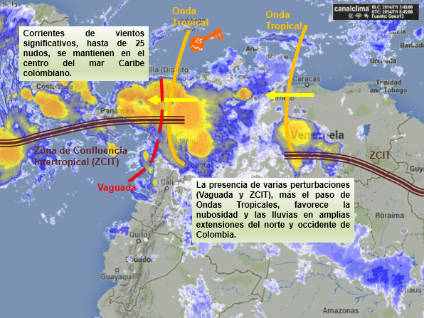 Durante la mañana, se mantendrán las lluvias, aunque en las próximas horas tenderán a disminuir, en amplias áreas de occidente de la región Caribe, incluida la zona marítima en el Golfo de Urabá. Las lluvias especialmente se concentrarán en Córdoba, Sucre, Bolívar, Magdalena y Atlántico. También, se mantendrá nublado y lluvioso en Antioquia, Chocó, las montañas santandereanas, el Eje Cafetero y Boyacá. Además núcleos nublados y lluvias en Vichada y Guainía.