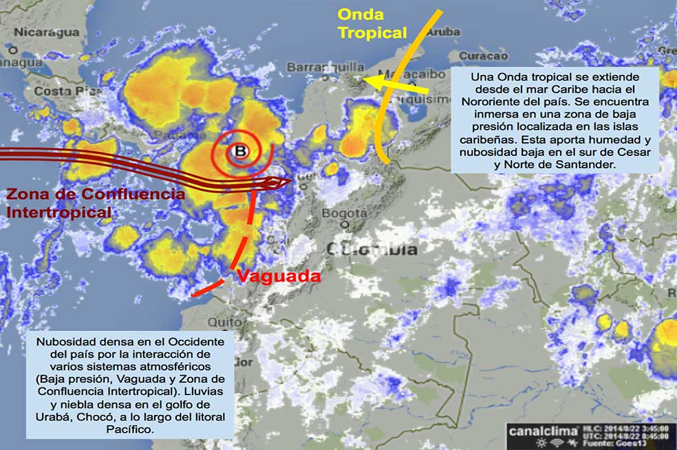La interacción de varios sistemas atmosféricos (Baja presión, Vaguada y Zona de Confluencia Intertropical) localizados en el occidente del país aportarán humedad y nubosidad densa en la mañana, con tiempo inestable en Chocó, litoral Pacífico y golfo de Urabá. De igual forma, el tránsito de una Onda tropical por el Nororiente del país generará precipitaciones de variada intensidad en el sur de Cesar, Norte de Santander y sectores puntuales en los límites entre Bolívar y Santander.